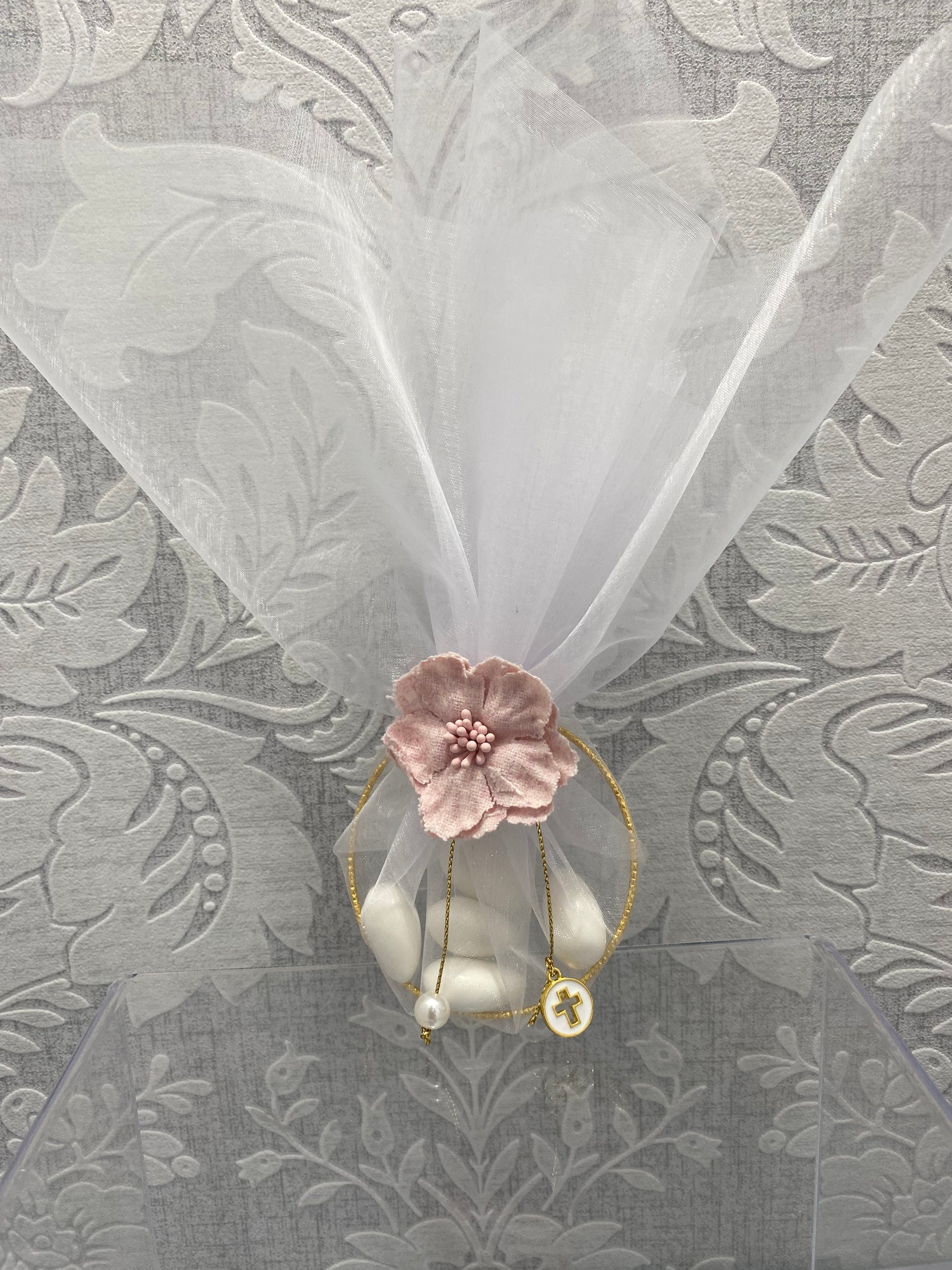 Elegant organza tulle with five sugar almonds, gold ring detail, beautifully finished with pink flower, cross pendant and pearl. Suitable for any occasion.