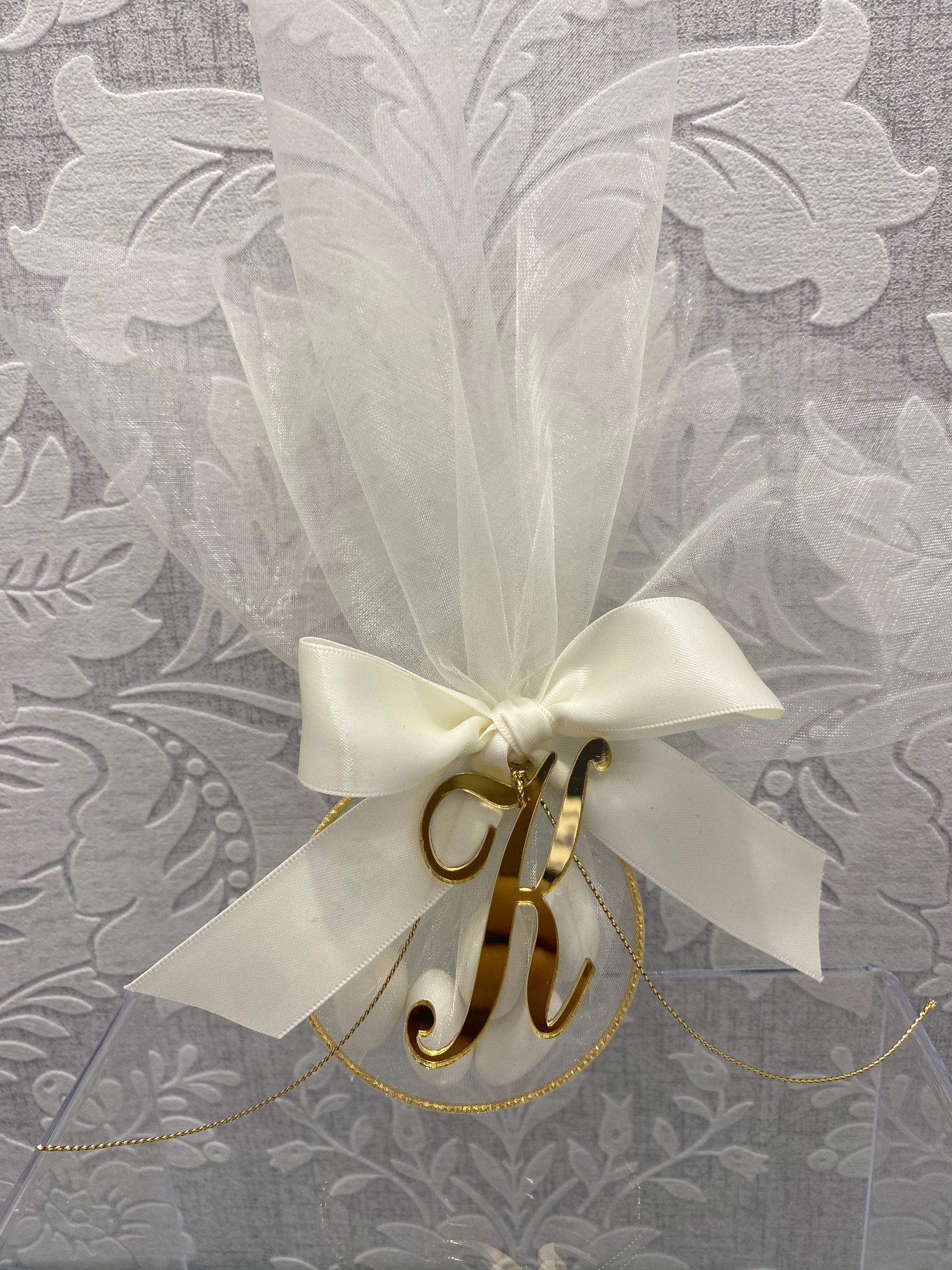Elegant gold ring with square organza tulle, personalized with acrylic initial, five sugar almonds and finished with a beautiful satin bow. Comes in a choice of white or ivory tulle. The initial can be gold, silver, or rose gold.